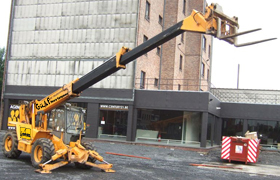 In industry the most common attachment for a tele-handler is pallet forks and the most common application is to move loads to and from places unreachable for a conventional forklift. For example, telehandlers have the ability to remove palletised cargo from within a trailer and to place loads on rooftops and other high places. The latter application would otherwise require a crane, which is not always practical or time-efficient.